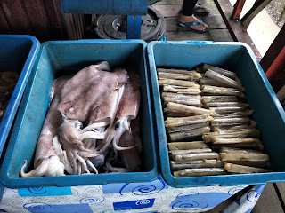 | Antara makanan laut di Anjung Ketam. Sotong dan bamboo clam ataupun mentaram. |